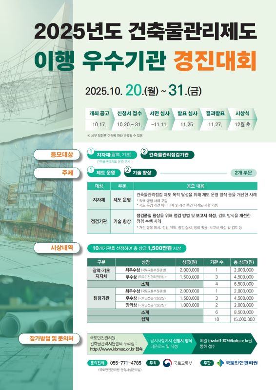 「2025년도 건축물관리제도 이행 우수기관 경진대회」를 아래의 포스터와 같이 개최하오니 많은 참여 부탁드립니다.
