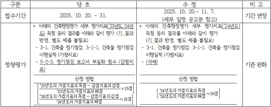「2025년도 건축물관리제도 이행 우수기관 경진대회」를 아래와 같이 수정 공고하오니 많은 참여 부탁드립니다.