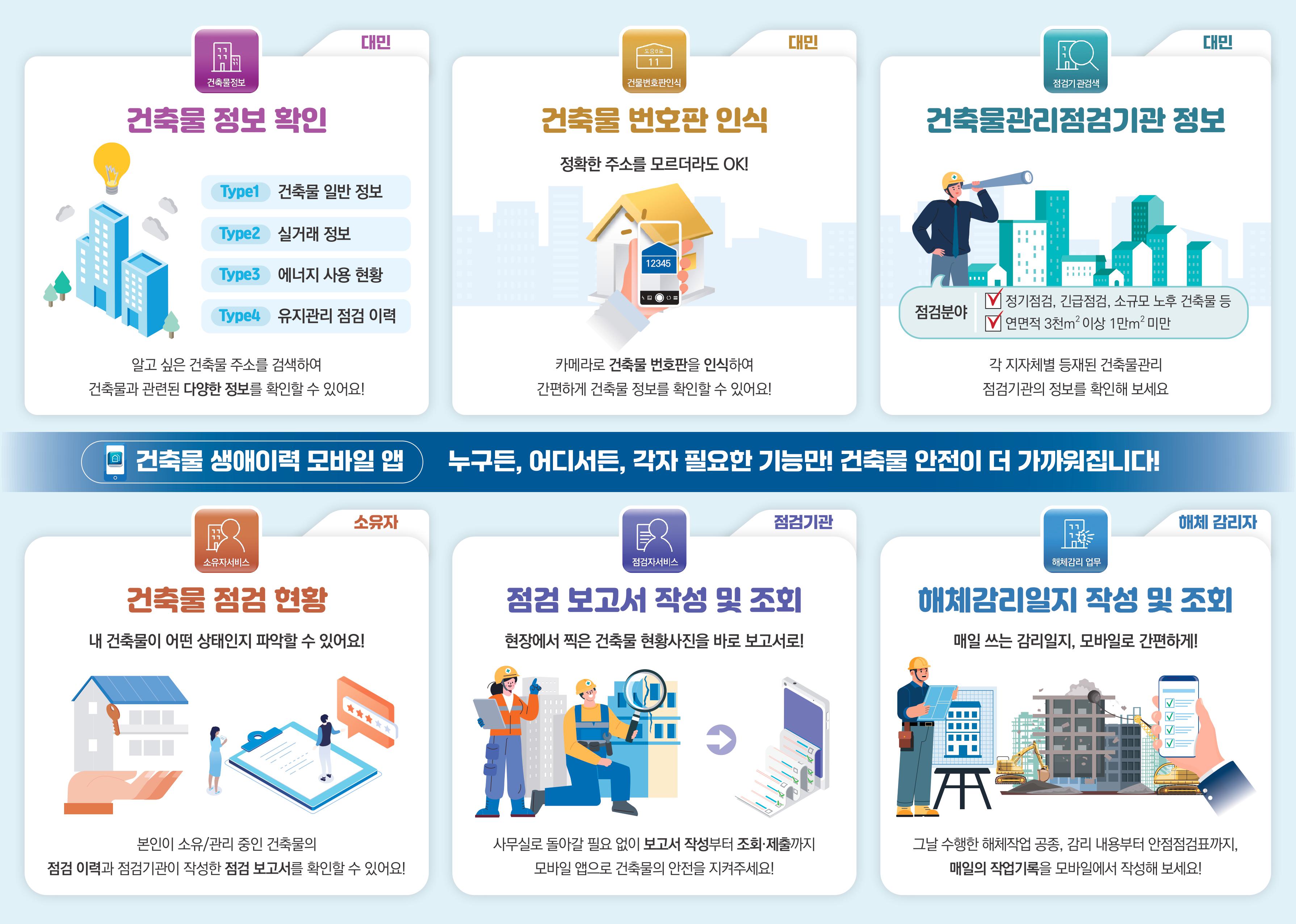 건축물 생애이력 관리시스템의 효율적이고 편리한 이용을 지원하기 위해 건축물 생애이력 모바일 앱을 운영 중에 있습니다.